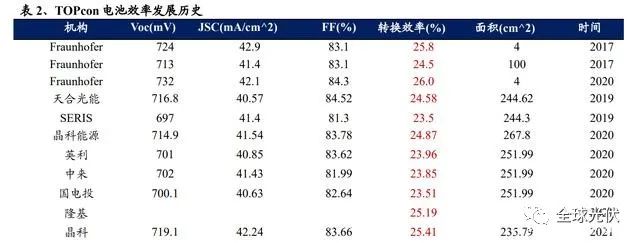 發(fā)展歷史:2013 年德國 Fraunhofer 研究所在 N 型 PERT 結(jié)構(gòu)基礎(chǔ)上,首次提 出 TOPCon 結(jié)構(gòu);2017 年 Fraunhofer 研究所在實驗室 TOPcon 電池上取得 25.8% 的效率記錄;2019 年,天合光能在面積為 244.62 平方厘米的 n 型襯底上制備出 正面最高效率為 24.58%的實驗室電池,并獲德國哈梅林太陽能研究所(ISFH) 下屬的檢測實驗室認(rèn)證,同年,天合光能 i-TOPCon 雙面電池大規(guī)模量產(chǎn)正面平 均轉(zhuǎn)換效率突破 23%。2021 年,晶科能源 TOPcon 電池在權(quán)威第三方測試認(rèn)證機 構(gòu)日本 JET 檢測實驗室標(biāo)定全面積電池最高轉(zhuǎn)化效率達到 25.4%,成為商業(yè)化全 面積電池效率記錄的保持者,為后續(xù)的 N 型 TOPCon 電池的擴產(chǎn)奠定基礎(chǔ)。
