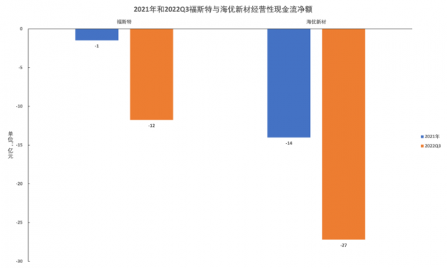 而且,隨著經(jīng)營規(guī)模的擴大,企業(yè)的營運壓力也不斷提升。截至2022Q3,福斯特和海優(yōu)新材的應(yīng)收賬款較2021年全年提高32%和52%,預(yù)付款項提高195%和347%。而流動比率則下降53%和25%,經(jīng)營性現(xiàn)金流更是呈凈流出態(tài)勢,且規(guī)模顯著提升,分別達到11.76億元和27.20億元,降幅高達695%和94%。