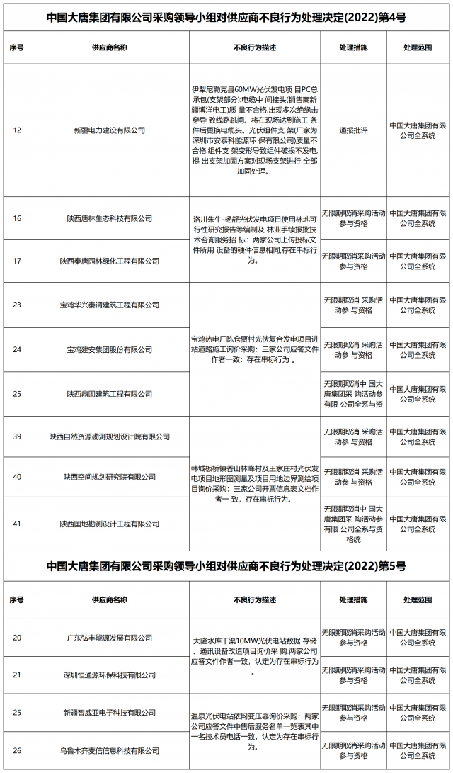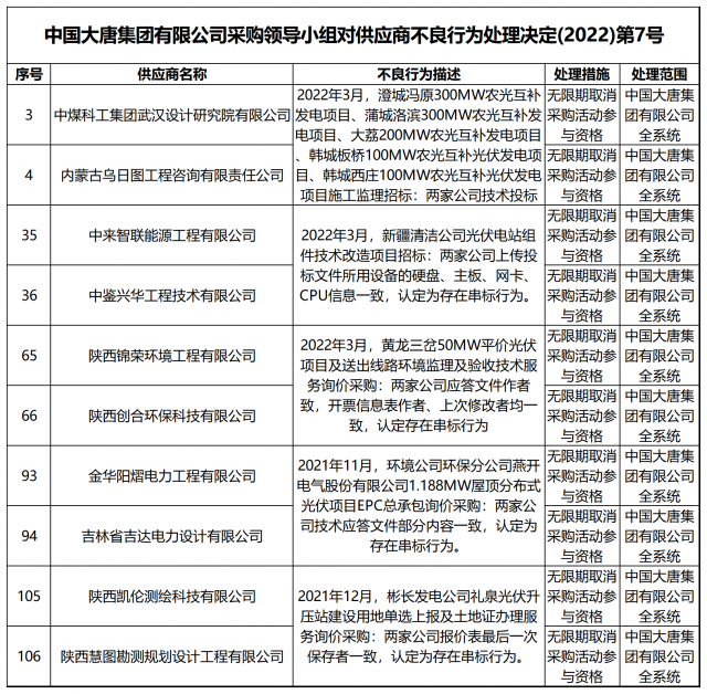 12月13日,中國(guó)大唐集團(tuán)有限公司關(guān)于供應(yīng)商不良行為處理情況的公告 (2022年第12批)公示,對(duì)出現(xiàn)不誠(chéng)信行為、履約不力以及產(chǎn)品質(zhì)量等問(wèn)題的供應(yīng)商進(jìn)行了處理。本批次大唐集團(tuán)共公布受處罰企業(yè)137家,其中,光伏相關(guān)企業(yè)共6家。