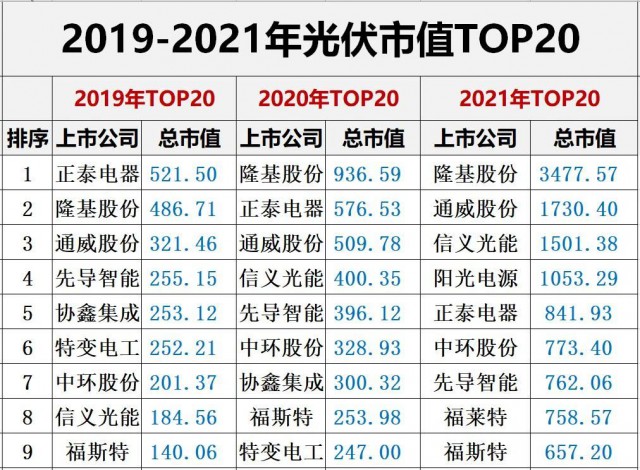 2005年以后,隨著無錫尚德、江西賽維、天合光能、阿特斯、晶科、晶澳等一眾中國光伏企業(yè)成功搶灘美國資本市場,由此開啟了中國光伏的大資本時代。時至今日,中國已有近150家光伏企業(yè)(光伏業(yè)務(wù)占比超30%)登陸全球資本市場。以下2001年至2021年期間,中國光伏上市企業(yè)“總市值TOP20,以下表格呈現(xiàn)總市值均為當年1月1日當天市值。