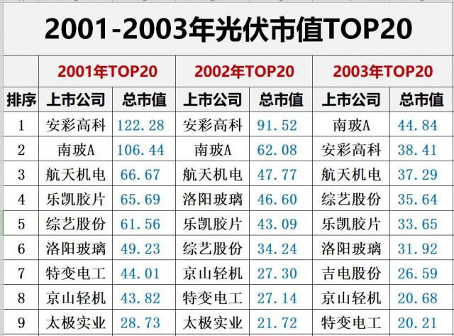 2001年,資本市場上只有約10家光伏上市公司,他們總市值合計為590億元,其中很多企業(yè)光伏業(yè)務(wù)占比都很小,都還算不上真正的光伏企業(yè)。