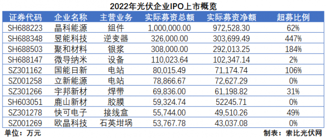 2022年,A股市場共有10家光伏企業(yè)完成IPO并成功上市,募資總額達到214.16億元,占A股市場5870億募資總額的比重為3.65%。值得一提的是,晶科能源募資總額高達100億元,是A股市場中僅有的五家達到百億級別的企業(yè)。此外,受益于廣闊的發(fā)展前景,機構投資者對于光伏企業(yè)也頗為“慷慨”,像昱能科技、聚和材料超募比例分別達到447%和184%。