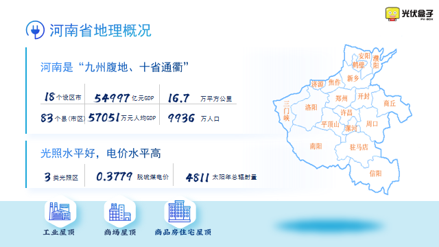 河南是“九州腹地,十省通衢”,有83個(gè)縣,9936萬(wàn)人口,戶用發(fā)展基礎(chǔ)好。加上電價(jià)水平較高,光照水平較好,極適合發(fā)展大批量的戶用光伏電站。