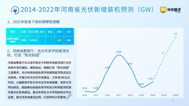 2021年11月5日河南省下發(fā)光伏保障性建設(shè)規(guī)模指標(biāo)共648MW。同時(shí),河南省教育廳提出打造“陽(yáng)光校園”工程,要求充分利用各級(jí)各類學(xué)校建筑屋頂?shù)冗m宜空間場(chǎng)地,開展分布式光伏開發(fā)建設(shè),力爭(zhēng)用3年左右時(shí)間,大幅提高學(xué)校分布式光伏發(fā)電規(guī)模。鼓勵(lì)推動(dòng)各級(jí)各類學(xué)校充分利用屋頂資源開展光伏發(fā)電建設(shè),打造特色示范基地。