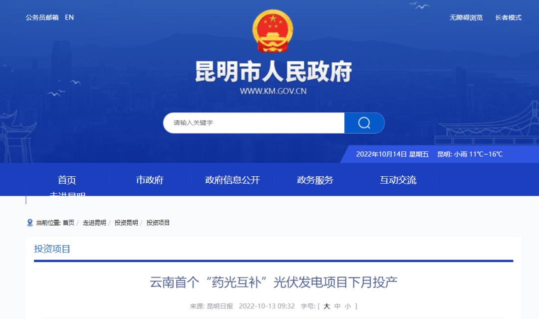 10月13日,昆明市發(fā)布首個(gè)“藥光互補(bǔ)”光伏發(fā)電項(xiàng)目下月投產(chǎn)。