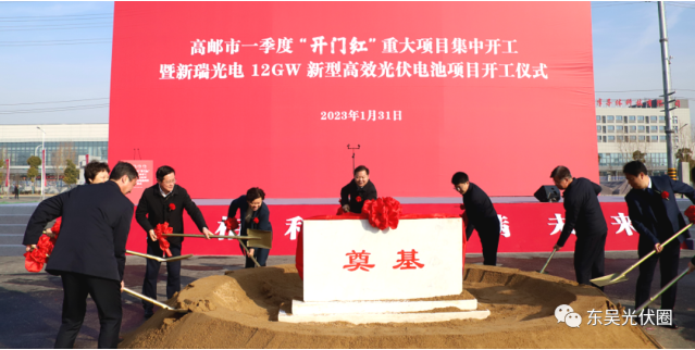 市委書記張利宣布開工,并和出席儀式的領(lǐng)導嘉賓共同為項目培土奠基。據(jù)悉,新瑞光電12GW新型高效光伏電池項目總投資100億元,是高郵經(jīng)開區(qū)有史以來首個百億元項目。該項目占地436畝,設(shè)備投資30億元,年產(chǎn)12GW高效TOPCon+HJT光伏電池。