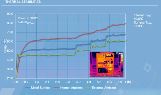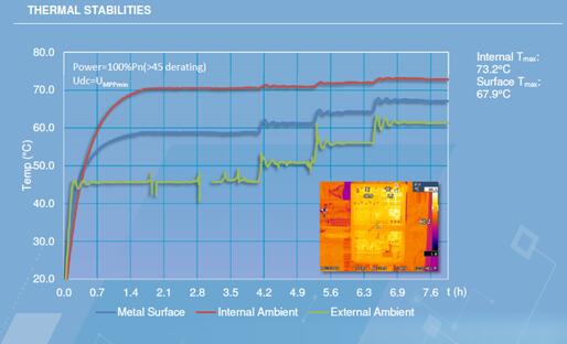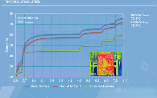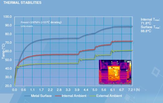 代表機(jī)型2:S廠商逆變器。逆變器內(nèi)部溫度比機(jī)箱外殼溫度高15度左右,在環(huán)境溫度45度條件下,內(nèi)部溫度約70度;