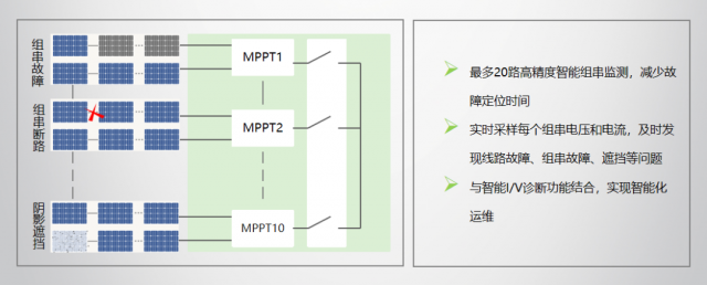 隨著技術(shù)的發(fā)展,逆變器在原有MPPT監(jiān)測的基礎(chǔ)上,早已實現(xiàn)智能的組串逐串監(jiān)測。組串監(jiān)測相較于MPPT監(jiān)測,對電壓電流的監(jiān)測精確到了每一個支路組串,用戶可以清晰地查看每一路組串的實時運行數(shù)據(jù),如果組串的電壓不一致,則反向證明是哪一個組串的組件塊數(shù)不一致,一目了然。