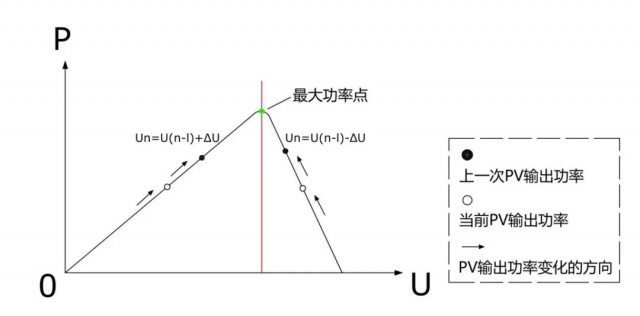 逆變器通過測量電流、電壓和功率,判斷出當(dāng)前工作點與峰值點的位置關(guān)系,智能調(diào)節(jié)工作點電壓(或電流),使其向峰值功率點靠攏,從而使光伏系統(tǒng)始終保持運行在峰值功率點附近。