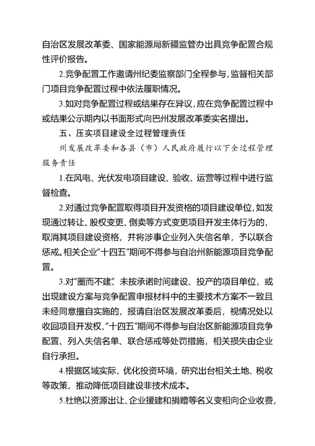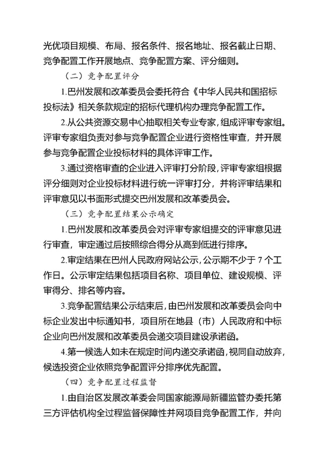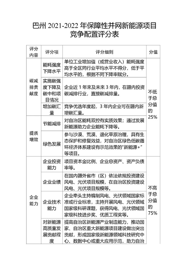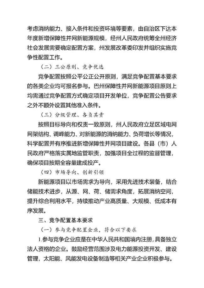 為貫徹落實(shí)碳達(dá)峰、碳中和任務(wù),持續(xù)推動(dòng)巴州風(fēng)電、光伏發(fā)電高質(zhì)量發(fā)展。按照《國(guó)家能源局關(guān)于2021年風(fēng)電、光伏發(fā)電開(kāi)發(fā)建設(shè)有關(guān)事項(xiàng)的通知》(國(guó)能發(fā)新能〔2021〕25號(hào)) 《新疆維吾爾自治區(qū)火電和風(fēng)電、光伏等公共資源開(kāi)發(fā)建設(shè)項(xiàng)目公開(kāi)招標(biāo)選定業(yè)主暫行辦法》(自治區(qū)人民政府第201號(hào)令)《自治區(qū)發(fā)展改革委國(guó)家能源局新疆監(jiān)管辦關(guān)于2021年風(fēng)電、光伏發(fā)電年度開(kāi)發(fā)建設(shè)方案有關(guān)事項(xiàng)的通知》(新發(fā)改能源〔2021〕419號(hào))等法律法規(guī)文件要求,現(xiàn)將巴州2021-2022年保障性并網(wǎng)新能源項(xiàng)目競(jìng)爭(zhēng)性配置公開(kāi)優(yōu)選業(yè)主工作公告如下: