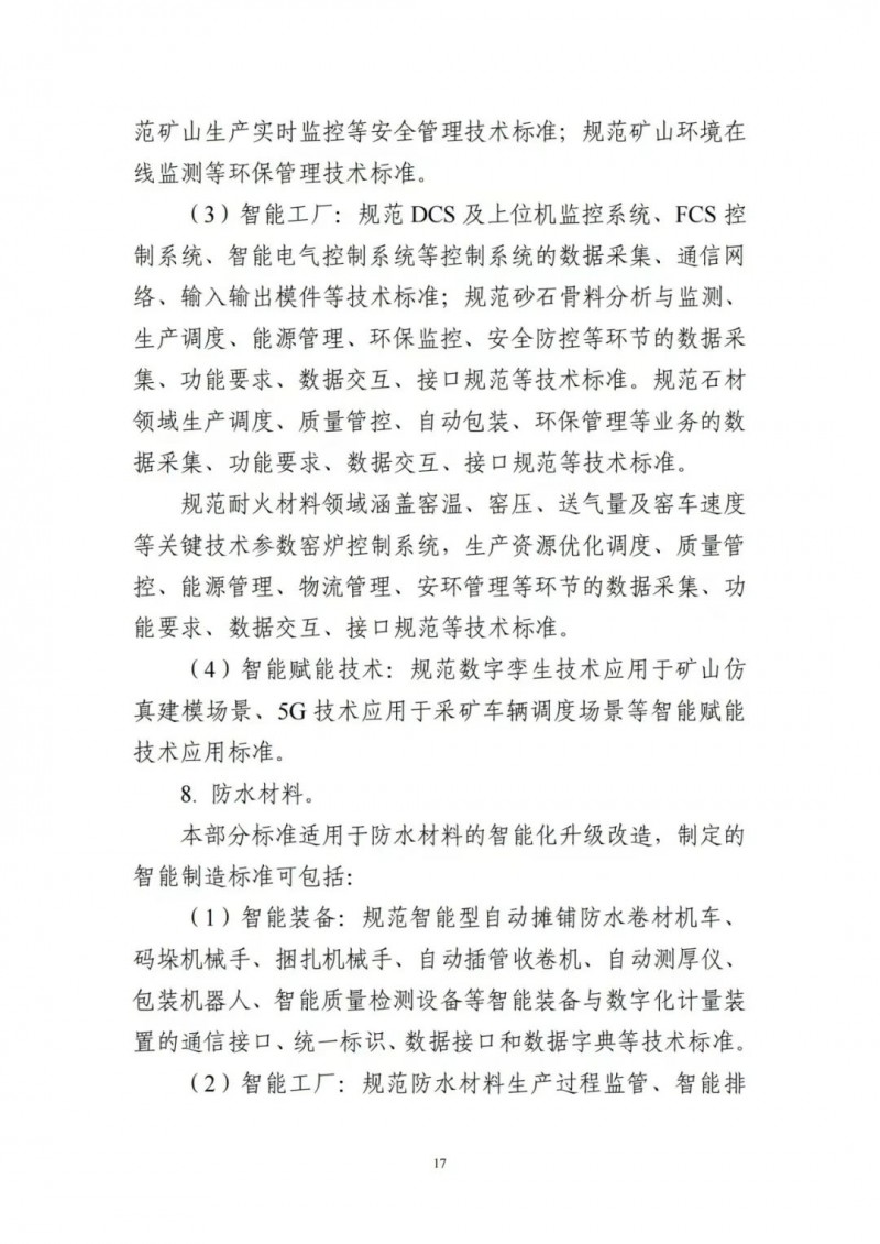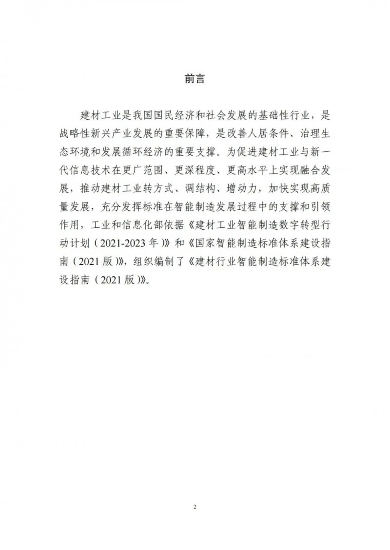 為貫徹落實(shí)《國家標(biāo)準(zhǔn)化發(fā)展綱要》,加強(qiáng)智能制造標(biāo)準(zhǔn)的統(tǒng)籌規(guī)劃,切實(shí)發(fā)揮標(biāo)準(zhǔn)對推動建材行業(yè)智能制造發(fā)展的支撐和引領(lǐng)作用,工業(yè)和信息化部依據(jù)《建材工業(yè)智能制造數(shù)字轉(zhuǎn)型行動計(jì)劃(2021-2023年)》和《國家智能制造標(biāo)準(zhǔn)體系建設(shè)指南(2021版)》,組織編制了《建材行業(yè)智能制造標(biāo)準(zhǔn)體系建設(shè)指南(2021版)》。現(xiàn)印發(fā)給你們,請結(jié)合本行業(yè)(領(lǐng)域)、本地區(qū)實(shí)際,在標(biāo)準(zhǔn)化工作中貫徹執(zhí)行。