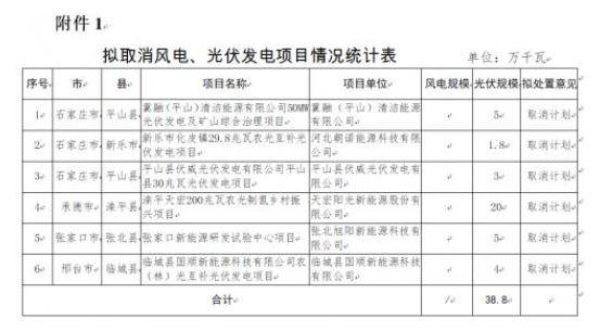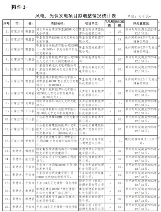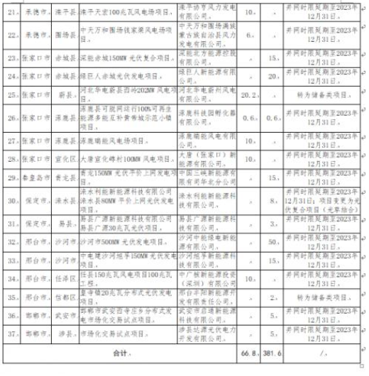 4月18日,河北省發(fā)改委對2022年到期風(fēng)電、光伏發(fā)電項(xiàng)目擬調(diào)整情況進(jìn)行公示。公示表示,為進(jìn)一步加強(qiáng)風(fēng)電、光伏發(fā)電項(xiàng)目管理,對2022年底已到期風(fēng)電、光伏發(fā)電項(xiàng)目建設(shè)進(jìn)度進(jìn)行了摸底統(tǒng)計(jì),并對逾期未建成項(xiàng)目提出了處置意見。其中,擬取消8個風(fēng)電、光伏發(fā)電項(xiàng)目,規(guī)模合計(jì)388MW;風(fēng)電、光伏發(fā)電項(xiàng)目擬調(diào)整37個,規(guī)模合計(jì)4484MW,其中,光伏項(xiàng)目3816MW。