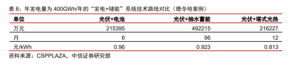 熔鹽儲(chǔ)能使用壽命可達(dá) 25-30 年,運(yùn)行穩(wěn)定性好、無爆炸、火災(zāi)等危險(xiǎn),具備安全友 好等特性。根據(jù)中控太陽能測算,光熱儲(chǔ)能調(diào)峰電站為光伏配置 20%熔鹽儲(chǔ)能服務(wù)可以有 效解決光伏棄光問題,同時(shí)在相同的儲(chǔ)能調(diào)峰補(bǔ)貼下,光伏+光熱儲(chǔ)能調(diào)峰電站的綜合上 網(wǎng)電價(jià)低于光伏+鋰電池儲(chǔ)能。 除光熱電站配套外,熔鹽儲(chǔ)能還可用于清潔供熱、提供工業(yè)蒸汽、火電靈活性改造等 方面。熔鹽儲(chǔ)能系統(tǒng)可以使用太陽能、谷電、工業(yè)余熱等方式加熱熔鹽工質(zhì)進(jìn)行儲(chǔ)存,在需求時(shí)段通過熔鹽放熱轉(zhuǎn)換為熱能實(shí)現(xiàn)工業(yè)蒸汽制備、建筑供熱等用途。以熔鹽儲(chǔ)熱供暖 系統(tǒng)為例,在夜間谷電時(shí)段可以通過谷電加熱熔鹽進(jìn)入高溫熔鹽罐,在用熱時(shí)段通過熔鹽 泵抽出高溫熔鹽與市政用水在換熱器中進(jìn)行熱交換為住宅小區(qū)提供熱水。熔鹽儲(chǔ)熱供暖系 統(tǒng)改造時(shí)只需要將燃煤鍋爐替換為熔鹽儲(chǔ)熱-加熱-換熱系統(tǒng),供水管道和末端設(shè)備可繼續(xù) 使用無需改造,改造建設(shè)成本較低;與電采暖相比,充分利用谷電加熱使運(yùn)行費(fèi)用大幅下 降,提高了供暖系統(tǒng)的經(jīng)濟(jì)性。