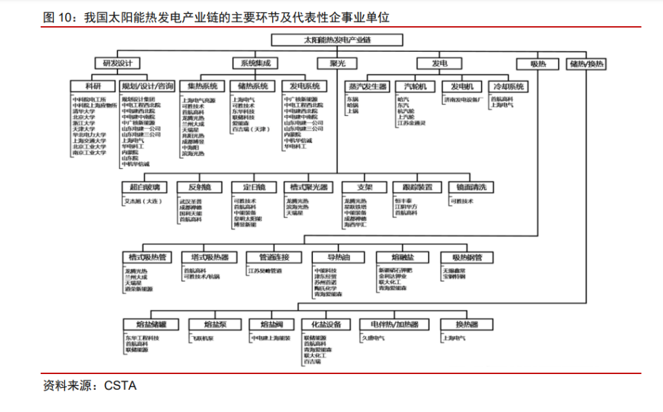 光熱發(fā)電產(chǎn)業(yè)鏈體系可分為研發(fā)、設(shè)計(jì)、制造、安裝等環(huán)節(jié),產(chǎn)業(yè)鏈國產(chǎn)化程度較高。 根據(jù) CSTA 數(shù)據(jù)顯示,在國家第一批光熱發(fā)電示范項(xiàng)目中,設(shè)備、材料國產(chǎn)化率超過 90%, 技術(shù)及裝備的可靠性和先進(jìn)性在電站投運(yùn)后得到有效驗(yàn)證;在青海中控德令哈 50MW 塔 式光熱發(fā)電項(xiàng)目中,設(shè)備和材料國產(chǎn)化率已達(dá)到 95%以上。