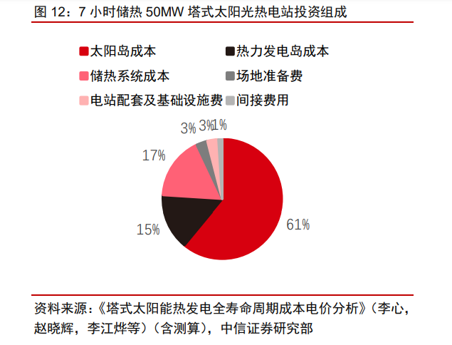 塔式太陽能熱電站中太陽島建設(shè)成本是電站建設(shè)的主要成本。太陽能熱發(fā)電站建造成 本主要分設(shè)備費(fèi)、安裝費(fèi)和土建費(fèi)三部分。綜合《塔式太陽能熱發(fā)電全壽命周期成本電價(jià) 分析》(李心,趙曉輝,李江燁等著)的測算數(shù)據(jù)來看,對(duì)于 10MW 以上的塔式太陽能熱 發(fā)電站而言,太陽島(含聚光系統(tǒng)和吸熱系統(tǒng))成本占電站建造成本的 55%以上;以 50MW 塔式太陽能熱發(fā)電電站為例,其太陽島成本高達(dá) 61%,熱力發(fā)電島(含熱力系統(tǒng)及輔機(jī)設(shè) 備、水循環(huán)、水處理系統(tǒng)、換熱設(shè)備、熱工控制系統(tǒng)、電氣系統(tǒng)、電網(wǎng)接入系統(tǒng)及儀表閥 門管路等)成本約 15%,儲(chǔ)熱系統(tǒng)成本約 17%。