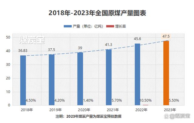 2023年1-4月全國能源生產情況:全國生產原煤15.27億噸,同比增長4.8%,煤炭寶初步預計2023年我國煤炭總產量為47.5億噸左右。