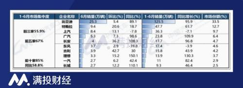 根據(jù)汽車協(xié)會數(shù)據(jù),二季度前十名車企銷量總計318.3萬輛,同比增長58.8%,占新能源汽車總銷量的85%。其中自主品牌的表現(xiàn)亮眼,份額不斷提高,比亞迪以125.5萬的銷量斷層領先,相當于第二名特斯拉銷量的2.6倍,比亞迪的市場份額提升至33.5%。上汽以36.3萬的銷量僅次于特斯拉,市場份額9.7%。