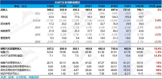 2023 年上半年,公司整車銷售業(yè)務(wù)實(shí)現(xiàn)營收 603 億元,同比增 23%,超出市場預(yù)期 10.8%。在銷量(不含領(lǐng)克、睿藍(lán))同比增長 12% 的但銷量數(shù)據(jù)市場已知的情況下,單車 ASP 超出市場預(yù)期 13.3%,帶動(dòng)整車銷售業(yè)務(wù)大幅度超預(yù)期。
