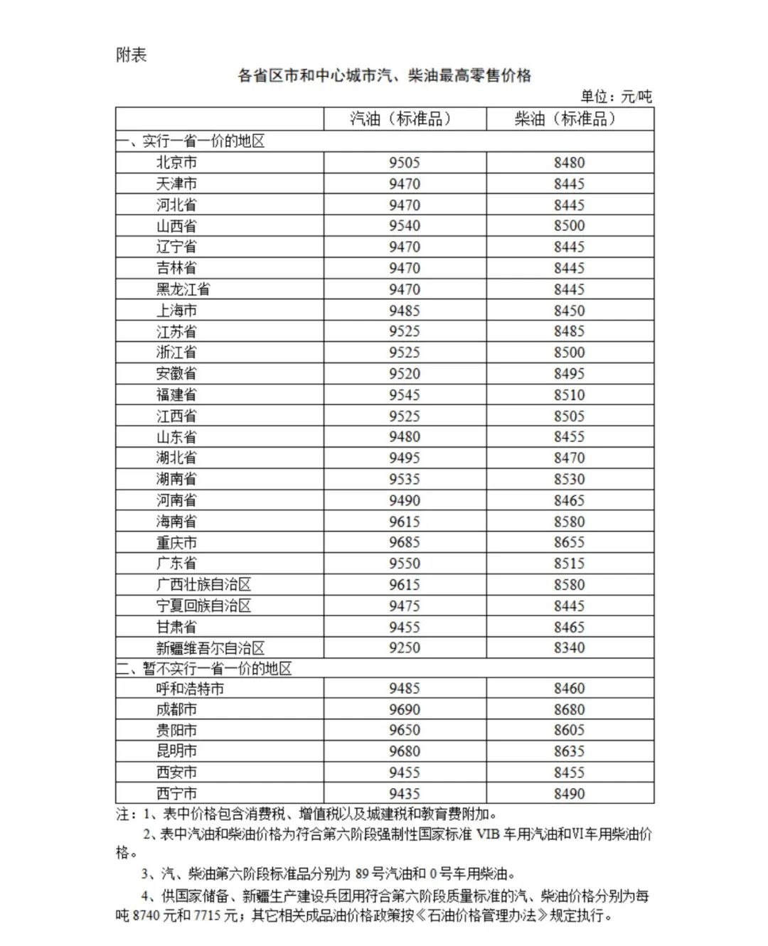 附:各省區(qū)市和中心城市汽、柴油最高零售價格