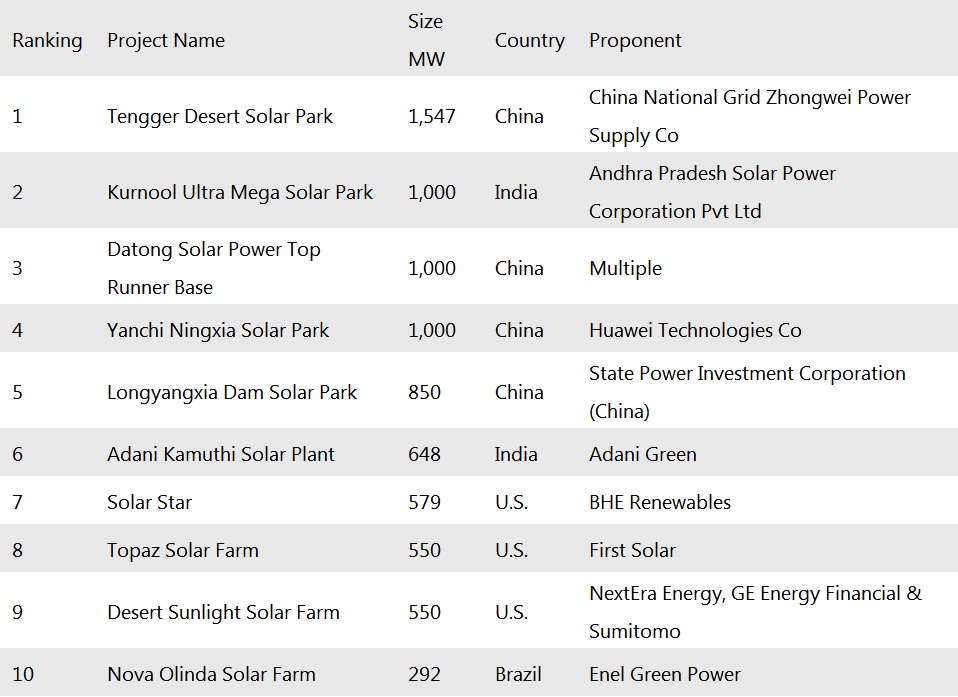 根據(jù)IEEFA的統(tǒng)計,全球最大的經(jīng)營實(shí)用規(guī)模的太陽能項(xiàng)目集中在中國和印度,包括: