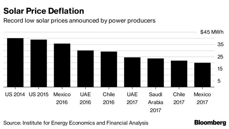 根據(jù)彭博新能源財經(jīng)數(shù)據(jù),IEEFA表示,2017年全球新增太陽能裝機(jī)98吉瓦,中國占53吉瓦。同時,發(fā)電資產(chǎn)使用期間的單位電力成本同比下降15%,至86美元/兆瓦時。