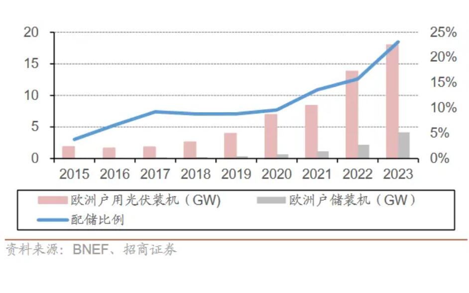 圖:歐洲戶用光儲裝機及配儲比例