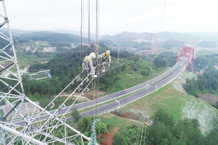 在云貴交界的北盤江大峽谷之上,國內(nèi)首個將兩端直流改造為三端直流的工程——云貴互聯(lián)通道工程與世界第一高橋北盤江大橋交相輝映。