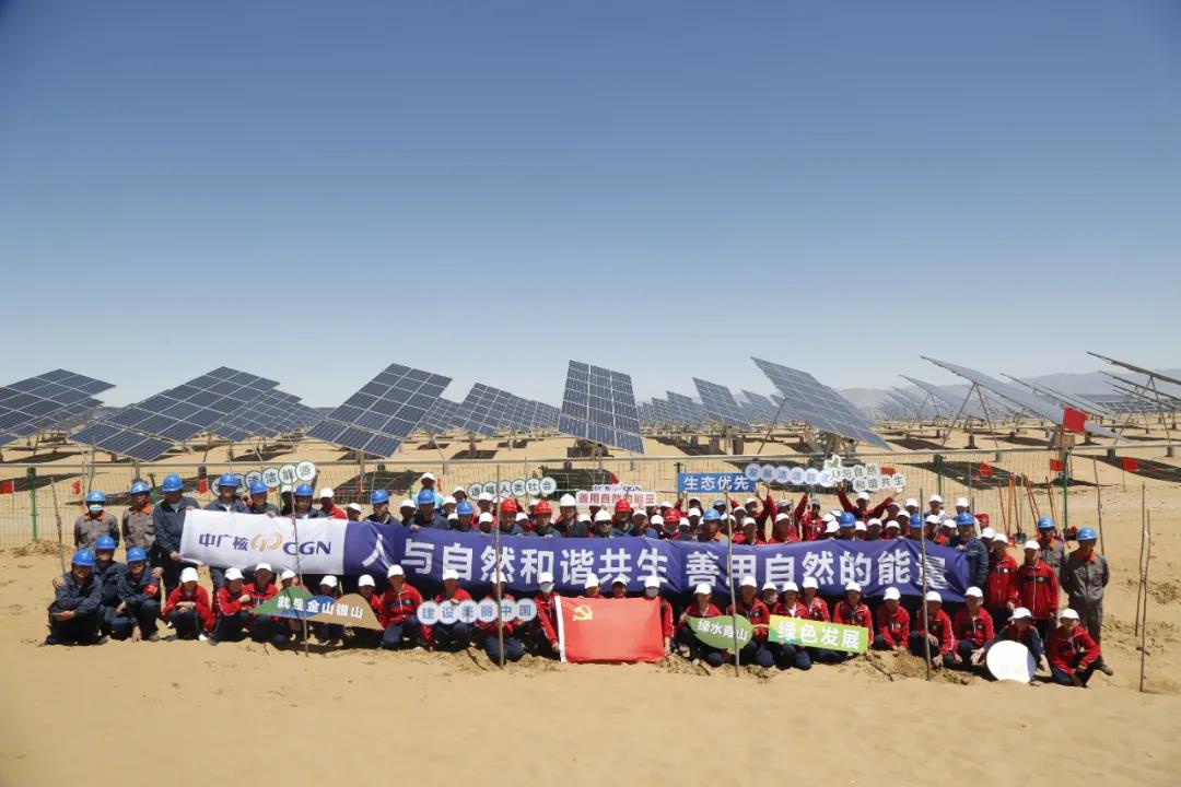 6月5日,第50個世界環(huán)境日之際,中國廣核集團(tuán)(簡稱中廣核)在內(nèi)蒙古庫布其沙漠朔方光伏電站組織開展“百人植樹”活動。兩年多以來,通過“板上發(fā)電、板下種植、板間養(yǎng)殖”的立體化新型產(chǎn)業(yè)循環(huán)方案,中廣核已在庫布其沙漠實現(xiàn)有效治沙2.7萬畝。