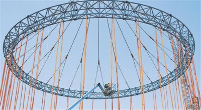 在“國(guó)和一號(hào)”示范工程某大型模塊吊裝現(xiàn)場(chǎng),工人乘坐升降機(jī)檢查吊具。國(guó)家電力投資集團(tuán)有限公司供圖