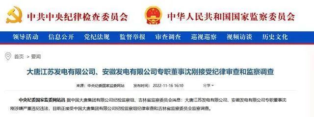 大唐江蘇發(fā)電、安徽發(fā)電專職董事涉嫌嚴(yán)重違紀(jì)違法被查
