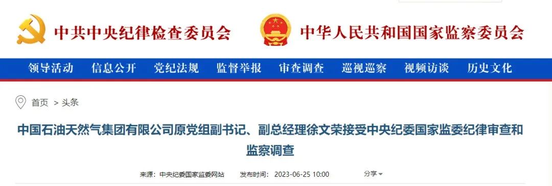 中央紀(jì)委國(guó)家監(jiān)委網(wǎng)站6月25日消息,中國(guó)石油天然氣集團(tuán)有限公司原黨組副書(shū)記、副總經(jīng)理徐文榮接受中央紀(jì)委國(guó)家監(jiān)委紀(jì)律審查和監(jiān)察調(diào)查。