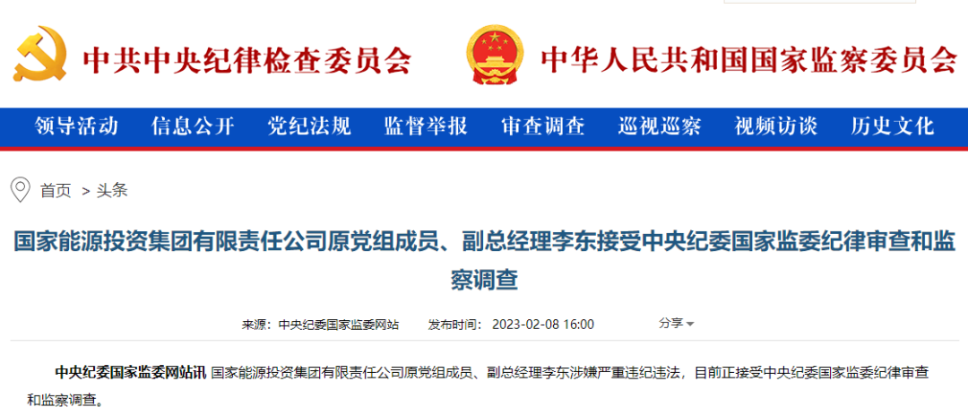 今年2月8日,據(jù)中央紀(jì)委國家監(jiān)委網(wǎng)站消息,國家能源投資集團有限責(zé)任公司原黨組成員、副總經(jīng)理李東涉嫌嚴(yán)重違紀(jì)違法,目前正接受中央紀(jì)委國家監(jiān)委紀(jì)律審查和監(jiān)察調(diào)查。