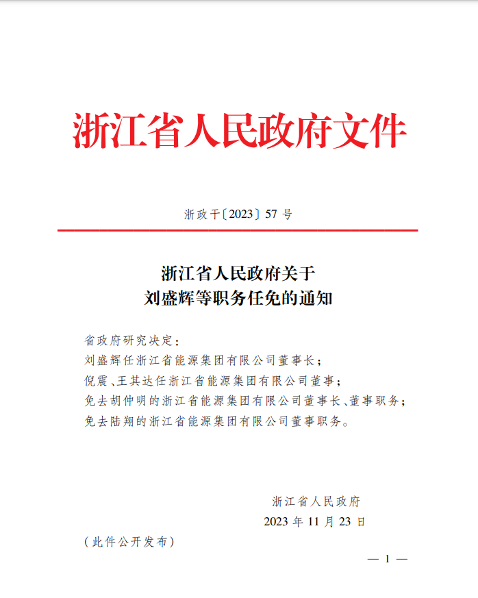 近日,據(jù)浙江省政府文件顯示,經(jīng)研究決定,劉盛輝任浙江省能源集團有限公司董事長;倪震、王其達(dá)任浙江省能源集團有限公司董事;免去胡仲明的浙江省能源集團有限公司董事長、董事職務(wù);免去陸翔的浙江省能源集團有限公司董事職務(wù)。
