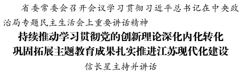 1月8日,江蘇省委常委會召開會議,深入學習領會習近平總書記在中央政治局專題民主生活會上的重要講話和中央通報精神,認真對照檢查,明確改進方向。省委書記信長星主持會議并講話。省委常委同志交流學習體會。會上通報了省委常委會專題民主生活會查擺問題整改落實、主題教育省級層面專項整治情況。