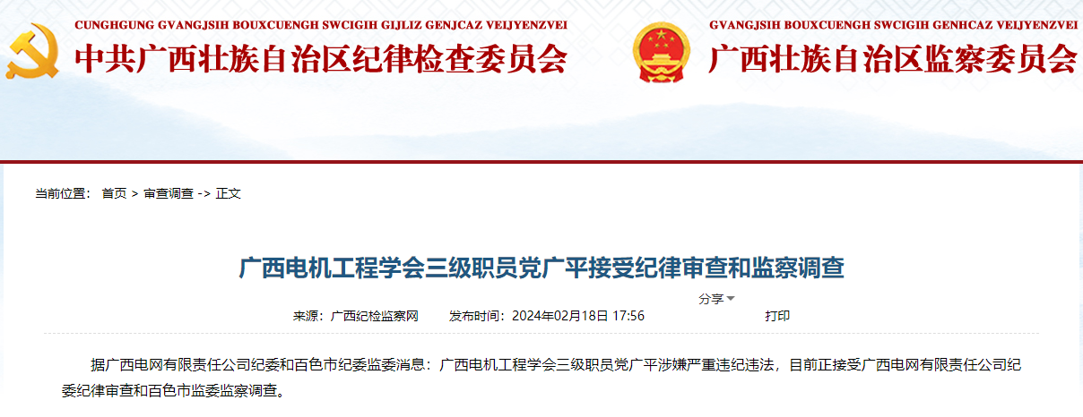 據(jù)廣西電網(wǎng)有限責(zé)任公司紀(jì)委和百色市紀(jì)委監(jiān)委消息:廣西電機(jī)工程學(xué)會三級職員黨廣平涉嫌嚴(yán)重違紀(jì)違法,目前正接受廣西電網(wǎng)有限責(zé)任公司紀(jì)委紀(jì)律審查和百色市監(jiān)委監(jiān)察調(diào)查。