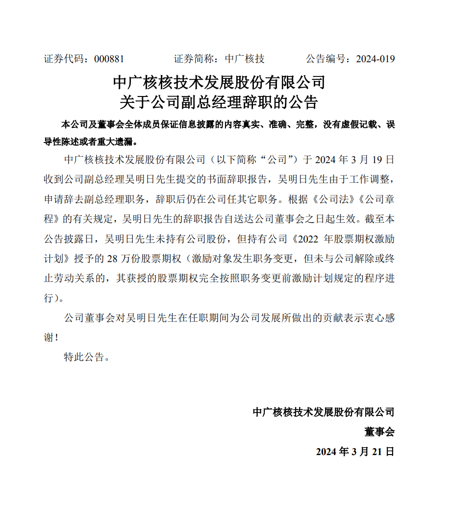 吳明日辭去中廣核核技術(shù)發(fā)展股份有限公司(以下簡(jiǎn)稱“中廣核技”)副總經(jīng)理職務(wù)。