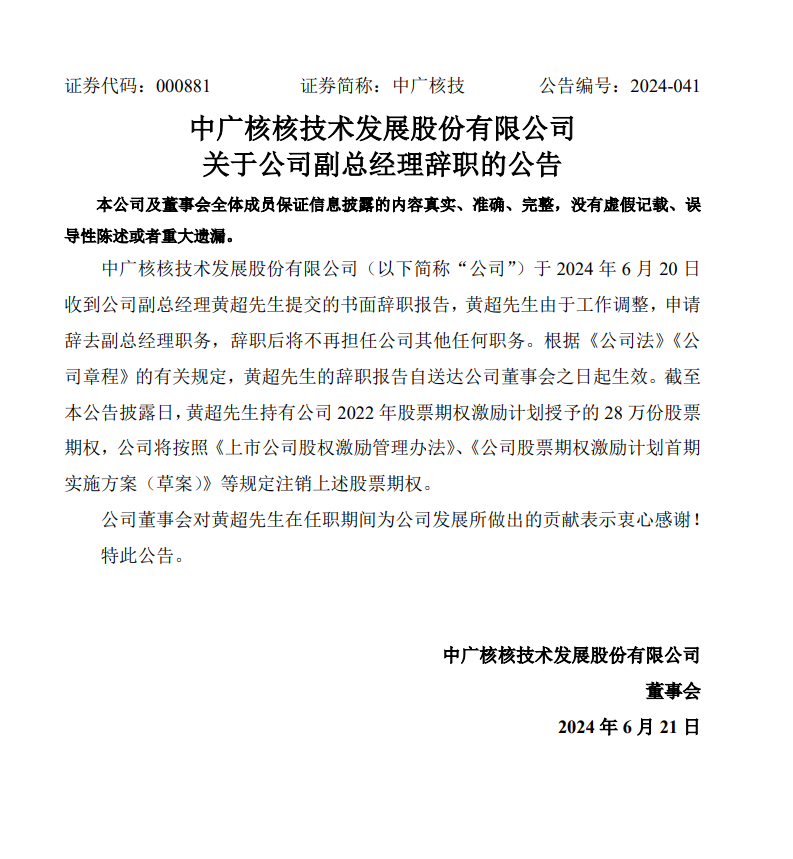 黃超辭去中廣核核技術(shù)發(fā)展股份有限公司(以下簡(jiǎn)稱“中廣核技”)副總經(jīng)理職務(wù)。