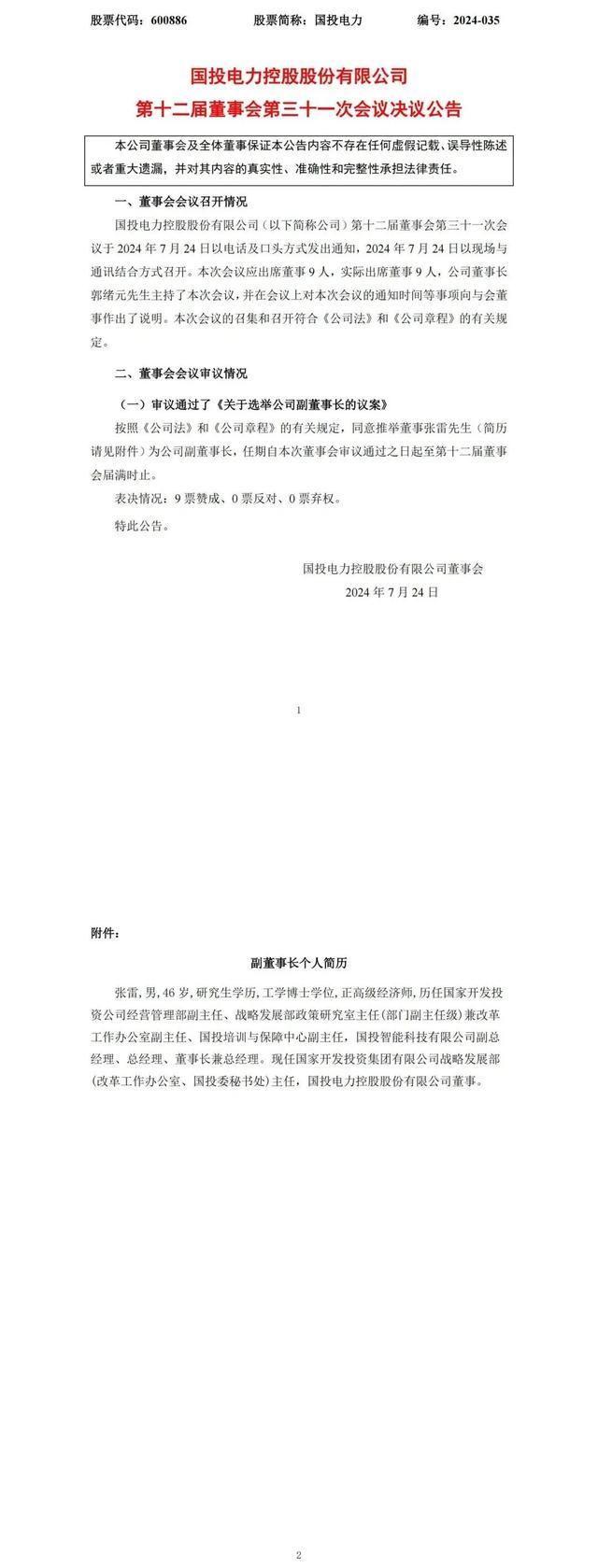 7月24日,國投電力發(fā)布公告,董事會審議通過了《關(guān)于選舉公司副董事長的議案》,同意推舉董事張雷先生為公司副董事長,任期自本次董事會審議通過之日起至第十二屆董事會屆滿時止。