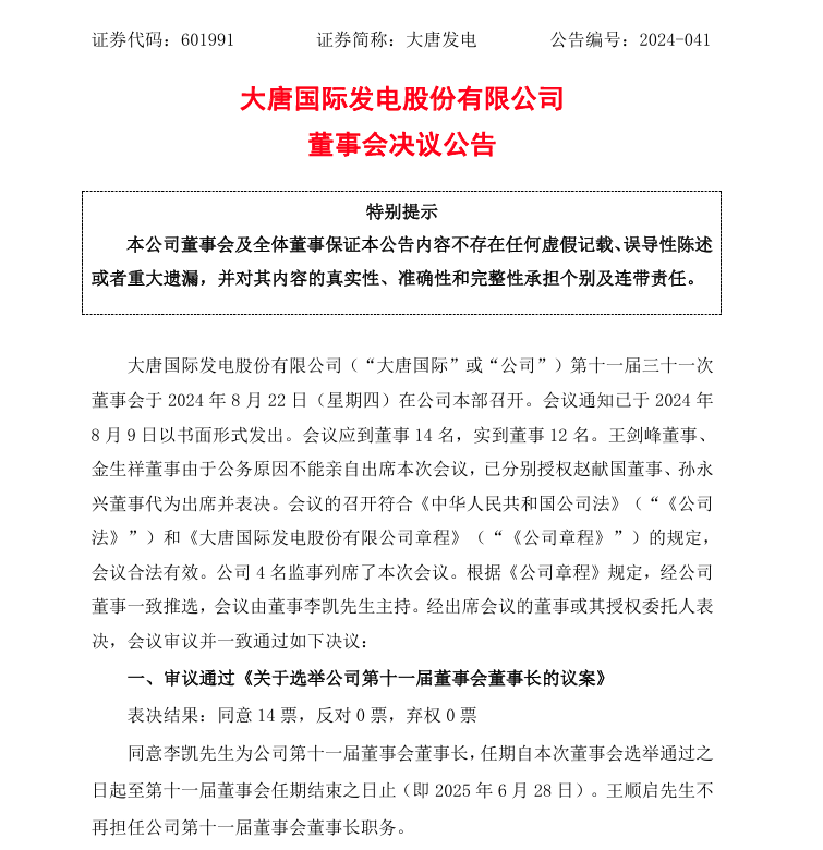 8月23日,大唐發(fā)電公告稱,董事會審議通過《關(guān)于選舉公司第十一屆董事會董事長的議案》,同意李凱先生為公司第十一屆董事會董事長,任期自本次董事會選舉通過之 日起至第十一屆董事會任期結(jié)束之日止(即2025年6月28日)。王順啟先生不再擔任公司第十一屆董事會董事長職務(wù)。