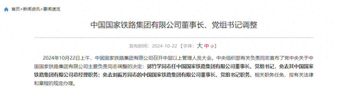 中央組織部有關負責同志宣布了黨中央關于中國國家鐵路集團有限公司主要負責同志調整的決定:郭竹學同志任中國國家鐵路集團有限公司董事長、黨組書記,免去其中國國家鐵路集團有限公司總經理職務;免去劉振芳同志的中國國家鐵路集團有限公司董事長、黨組書記職務。