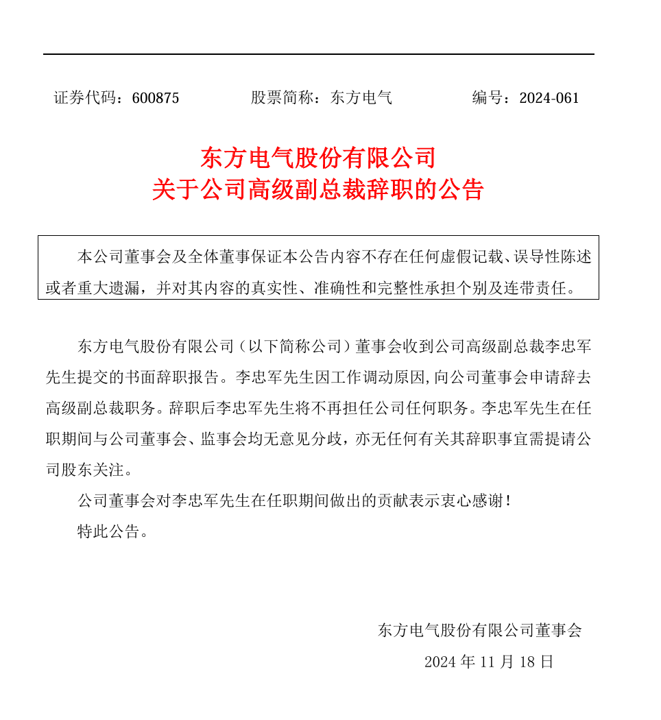 11月18日,東方電氣發(fā)布公告稱,公司董事會(huì)收到公司高級(jí)副總裁李忠軍先生提交的書面辭職報(bào)告。李忠軍先生因工作調(diào)動(dòng)原因,向公司董事會(huì)申請(qǐng)辭去高級(jí)副總裁職務(wù)。辭職后李忠軍先生將不再擔(dān)任公司任何職務(wù)。