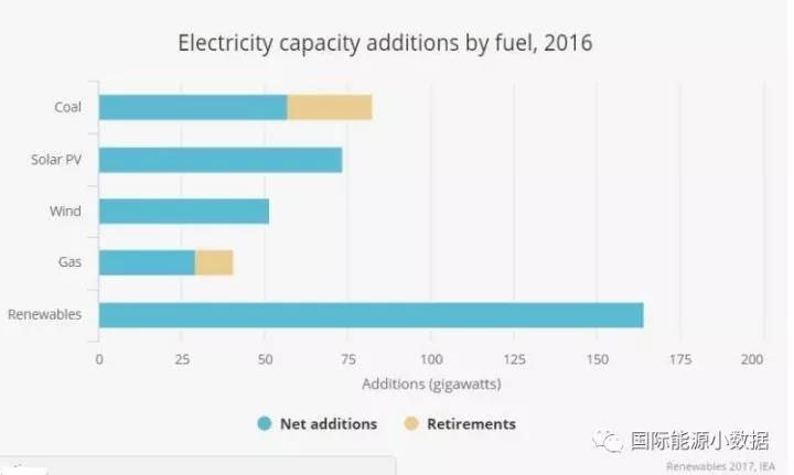 國(guó)際能源署發(fā)布2017年可再生能源報(bào)告,確認(rèn)2016年全球新增可再生能源裝機(jī)165吉瓦,其中太陽(yáng)能光伏裝機(jī)達(dá)到74吉瓦(約46%來(lái)自中國(guó)),首次超過煤電新增裝機(jī)(57吉瓦)。
