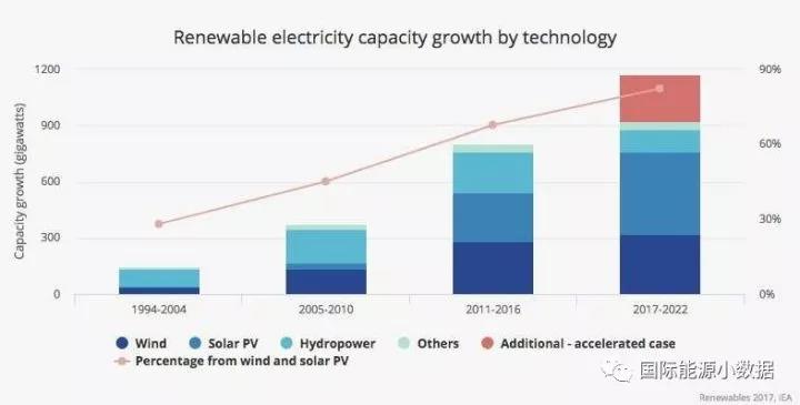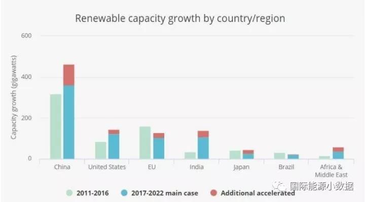 過去對(duì)于可再生能源發(fā)展規(guī)模預(yù)測(cè)曾經(jīng)偏保守的IEA現(xiàn)在預(yù)測(cè),2017-2022年間全球可再生能源新增裝機(jī)將至少達(dá)到920吉瓦(其中風(fēng)電321吉瓦、光伏438吉瓦),其中363吉瓦(39%)將來(lái)自中國(guó)。如果各國(guó)政策支持力度加大的樂觀情形下,2017-2022年間可再生能源新增裝機(jī)可能達(dá)到1150吉瓦,其中464吉瓦(40%)來(lái)自中國(guó)。