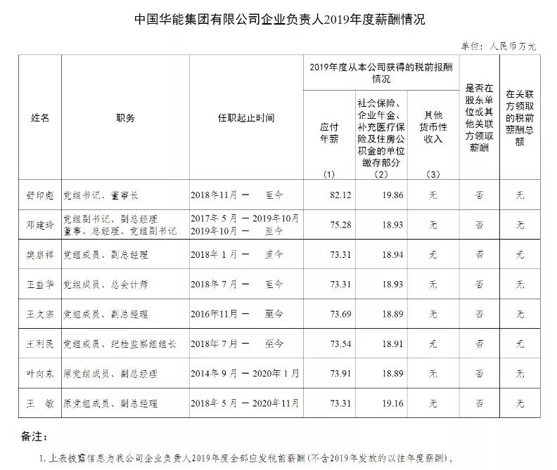 國家能源集團2019年度薪酬情況