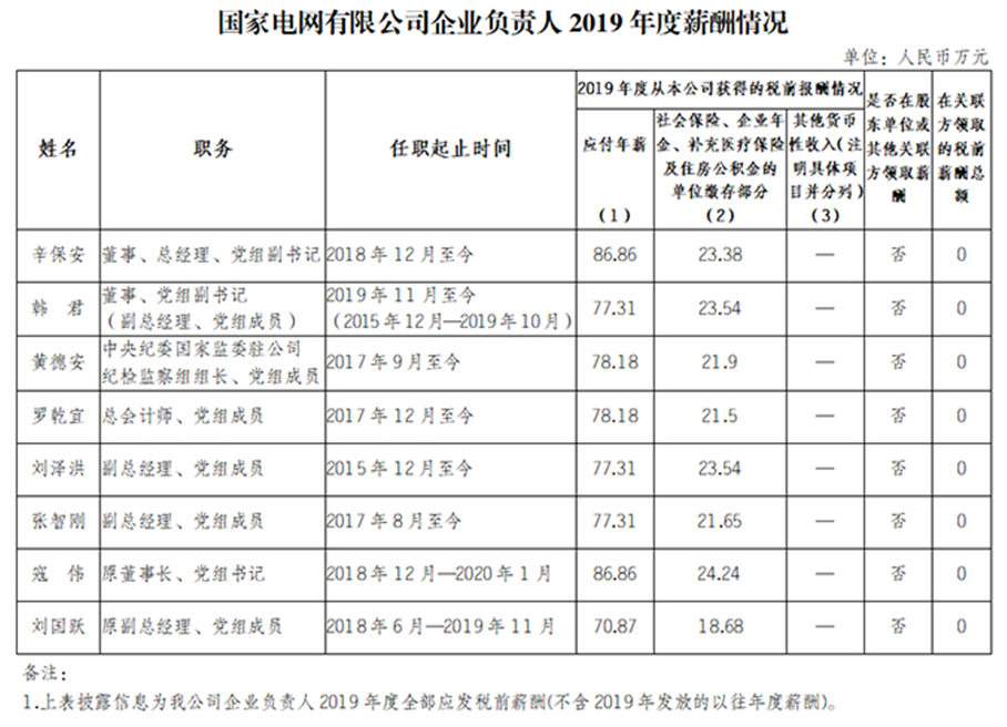 其中,以國家電網(wǎng)總經(jīng)理、黨組副書記辛保安86.86萬元年薪為最高,時任國家電網(wǎng)董事長、黨組書記寇偉年薪同樣是86.86萬元。其次為華能集團黨組書記、董事長舒印彪年薪82.12萬元。