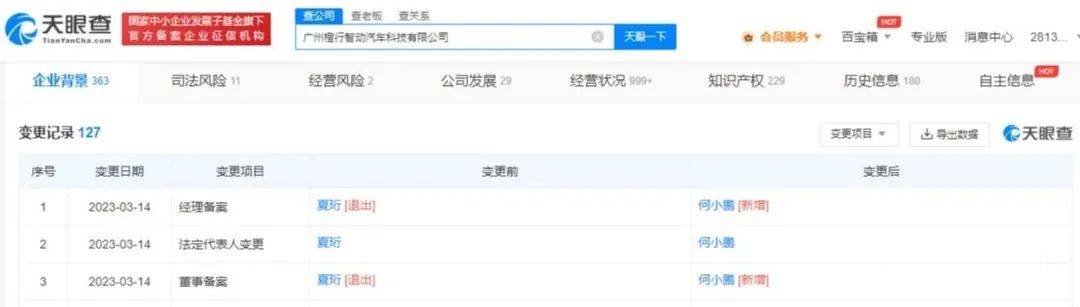 根據(jù)天眼查App顯示,近日,廣州橙行智動(dòng)汽車(chē)科技有限公司發(fā)生工商變更,夏珩卸任法定代表人、執(zhí)行董事、經(jīng)理,由何小鵬接任。不久前,夏珩已接連卸任廣東小鵬汽車(chē)科技有限公司、廣州小鵬汽車(chē)科技有限公司職務(wù),并均由何小鵬接任。