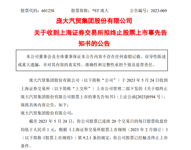 《告知書》顯示,截至2023年5月24日,龐大集團股票收盤價已連續(xù)20個交易日低于人民幣1元,根據(jù)《上海證券交易所股票上市規(guī)則(2023年2月修訂)》規(guī)定,龐大集團股票已經(jīng)觸及終止上市條件,上交所依據(jù)相關(guān)規(guī)定對龐大集團股票作出終止上市的決定。