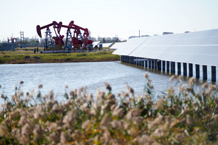 2023年9月19日,在黑龍江大慶油田星火水面光伏電站,電站設(shè)施與附近的抽油機(jī)相映成趣。新華社記者 王建威 攝