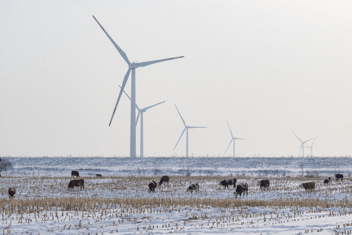 2023年11月16日拍攝的位于黑龍江省鶴崗市綏濱縣的一處風(fēng)電場(chǎng)的風(fēng)機(jī)。新華社記者 謝劍飛 攝