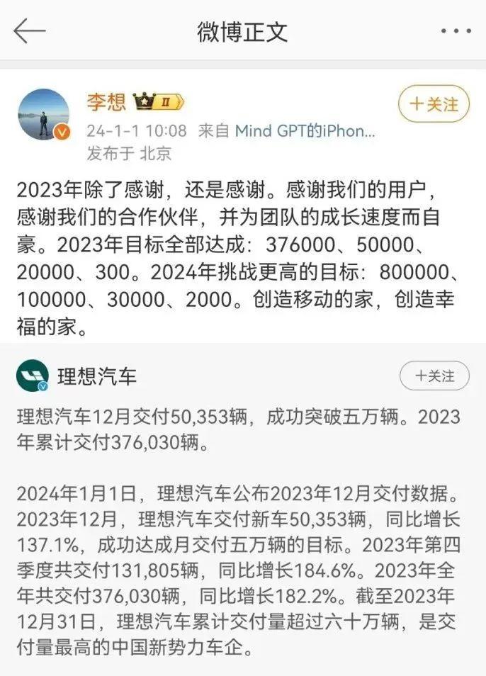 理想汽車董事長(zhǎng)兼ceo李想在社交媒體發(fā)聲:“2023年除了感謝,還是感謝。感謝我們的用戶,感謝我們的合作伙伴,并為團(tuán)隊(duì)的成長(zhǎng)速度而自豪。2023年目標(biāo)全部達(dá)成。”